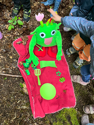 Am nächsten Morgen jedoch galt es für die Zwergnasenkinder einen Schatz im Wald zu finden. Das kleine Wir begleitete die Gruppe. Heute war sein großer Tag, es hatte Geburtstag! Und hatte tatsächlich als kleines Dankeschön für alle etwas mitgebracht.
