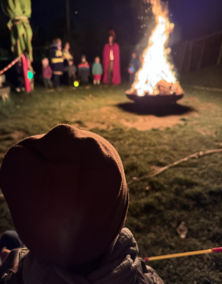 Zurück in der Kita erwartete uns dann ein großes beeindruckendes Feuer in unserem Garten. Dort wurde noch einmal das St. Martinslied gesungen. Und weil St. Martin eben fast alles weiß, wusste er auch dass unsere S. genau heute 4 Jahre alt wurde.
